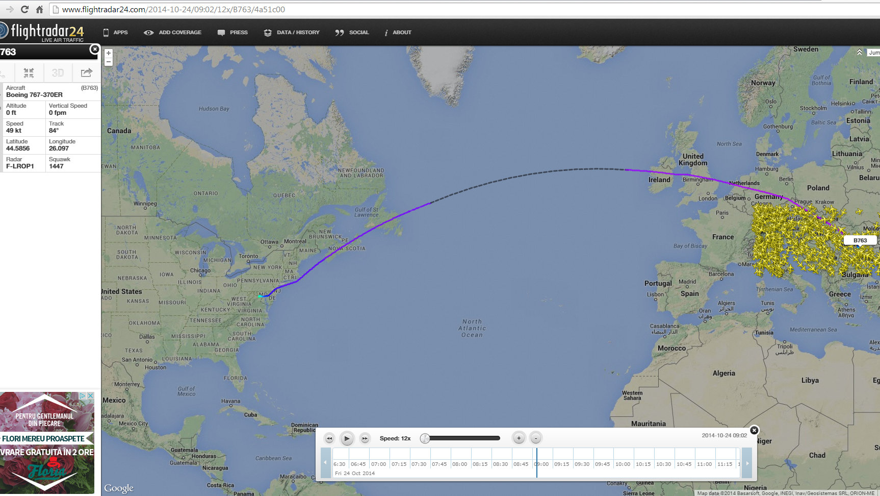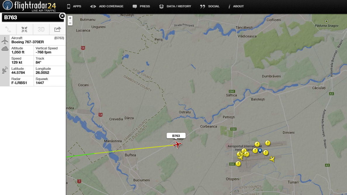 Pe FlightRadar24 apare la respectiva oră, dacă vă uitați în history. Acolo scrie că este un Boeing 767-370ER (adică Extended Range?), dar nu scrie al cui este. De unde vine avionul? Washington, aeroportul Dulles.