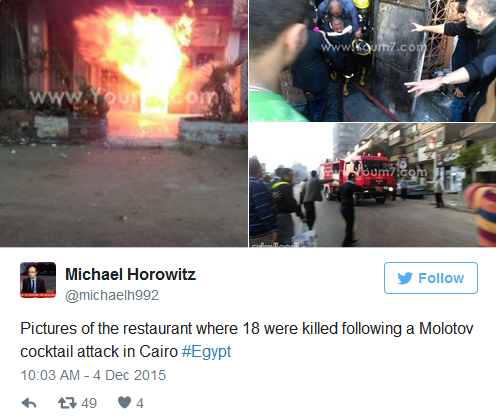 Agentia de stiri MENA din Egipt citeaza o sursa din politie care sustine ca ar fi vorba de trei atacatori, care au aruncat cocktailurile Molotov in local, iar apoi au fugit.