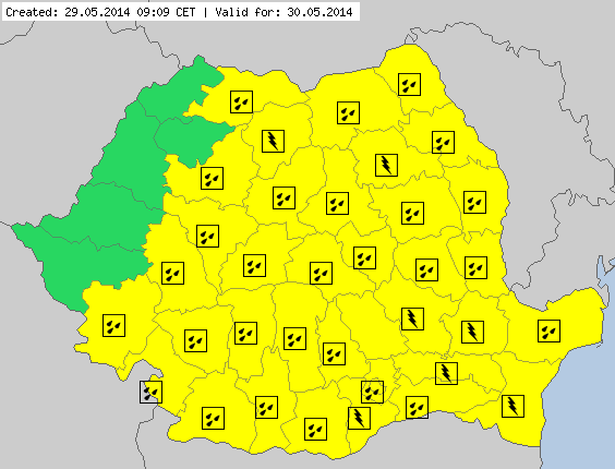 Din dimineaţa zilei de vineri, 30 mai până în noaptea de sâmbătă spre duminică (31 mai / 1 iunie), vor fi intervale de timp cu instabilitate atmosferică accentuată în sudul, estul şi centrul ţării şi în toată zona montană. Vor fi averse ce vor avea şi caracter torenţial, descărcări electrice, intensificări ale vântului ce pot lua şi aspect de vijelie şi căderi de grindină. Cantităţile de apă vor depăşi 25…30 l/mp şi izolat 50…60 l/mp.
