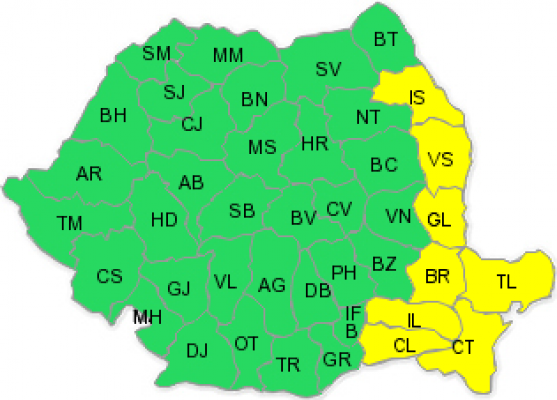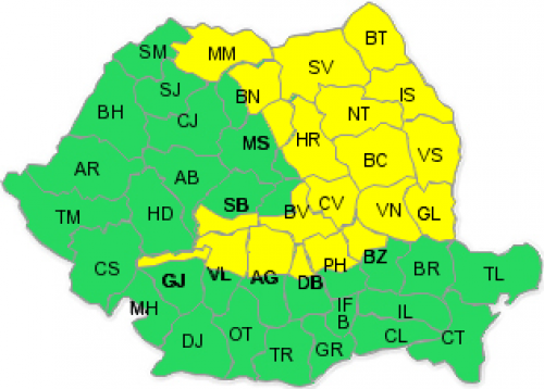 Administrația Națională de Meteorologie a emis două atenţionări cod galben de ploi, ninsori şi intensificări ale vântului, valabile de miercuri de la ora 18.00 până vineri la ora 12.00. Va ploua, în unele zone vor fi lapoviţă şi ninsoare, iar vântul va atinge la rafală viteze de peste 55 de kilometri pe oră.