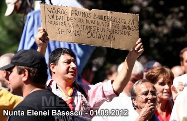 Un alt moment în care bărbatul s-a făcut remarcat a fost nunta Elenei Băsescu, 01.09.2012, fiica fostului preşedinte al României. Acesta a afişat o pancartă în care cerea demisia fostului preşedinte. Alături de acesta a fost şi domnul cu ochelari – prezent şi la audierile Elenei Udrea