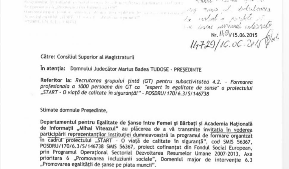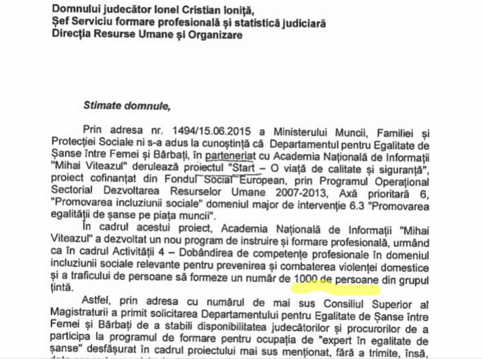 Solicitarea a fost trimisa CSM-ului sub pretextul programul „START- O viata de calitate in siguranta”, care se desfasoara de catre „Departamentul pentru egalitate de sanse intre femei si barbati” in parteneriat cu Academia Nationala de Informatii „Mihai Viteazul” a SRI-ului.
