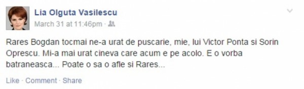 „Rareş Bogdan tocmai ne-a urat de puşcărie, mie, lui Victor Ponta şi Sorin Oprescu. Mi-a mai urat cineva care acum e pe acolo. E o vorbă bătrânească… Poate o să o afle şi Rareş…”, scrie Lia Olguţa Vasilescu pe pagina sa de Facebook.