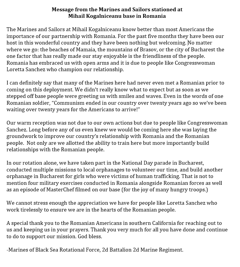 De surprize a avut parte, insa, si Congresmenul Loretta Sanchez. Prima surpriza a constat in citirea unei scrisori adresate Lorettei Sanchez de puscasii marini (US Marines) stationati la baza militara de la Kogalniceanu.