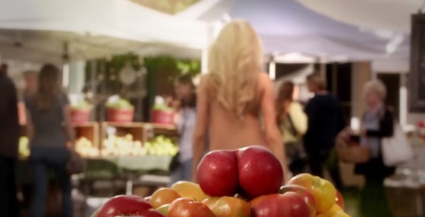 Filmarea dă impresia că frumoasa blondă ar fi complet dezbrăcată, într-un cadru posteriorul ei fiind ascuns strategic de o roșie plasată în prim-plan, iar în altă imagine, doi pepeni puși pe un cântar acoperind perfect sânii tinerei.