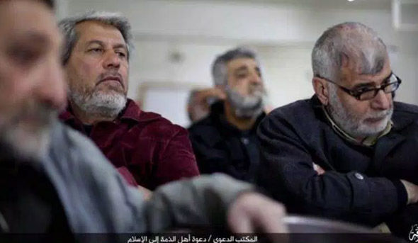 Aceasta este si o parte de pedepsei impotriva celor care nu vor sa se converteasca la islam. Express a publicat fotografii in care un militant jihadist sustine discursuri in fata unor crestini din Siria.