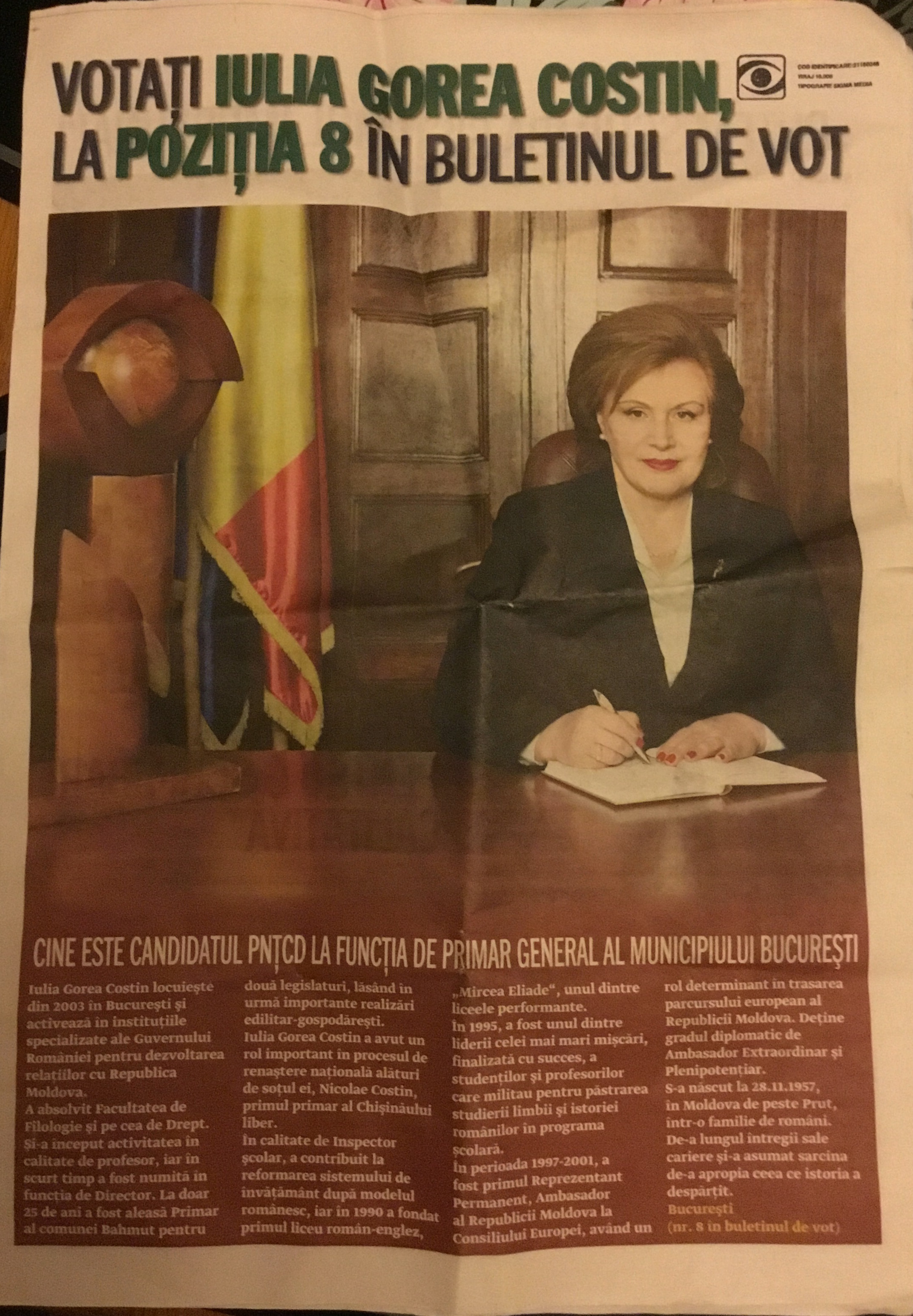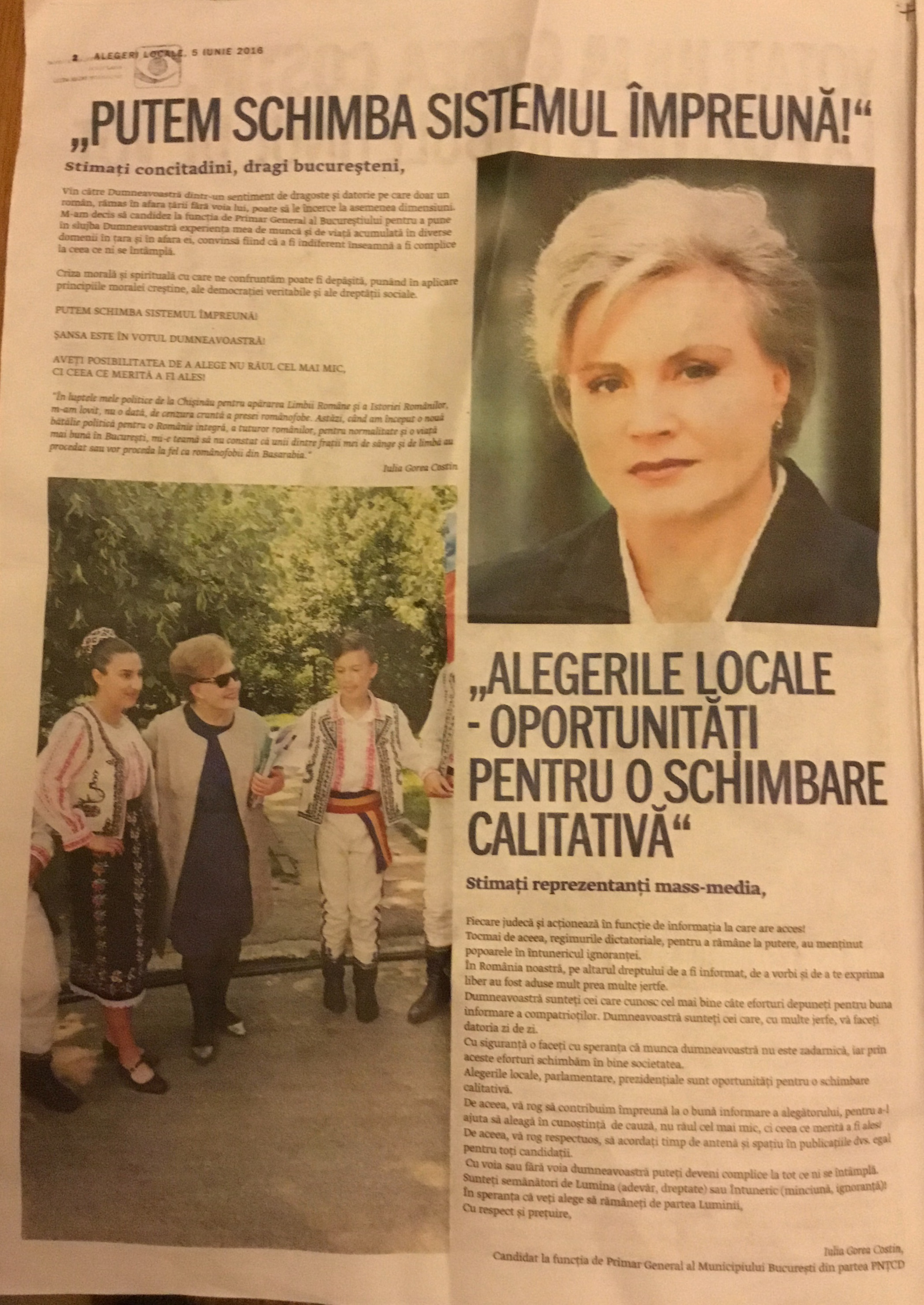 N.B. Paula Popa, sora judecătorului Gică Popa din Procesul Ceauşeştilor, care m-a vizitat la BAR în ultima vreme pentru a mă convinge că Gică Popa nu s-a sinucis, ci a fost ucis, mi-a adus, la ultima întîlnire, venind împreună cu Liviu Petrina, o publicație de patru pagini, scoasă de PNȚCD cu prilejul Localelor de anul acesta, dedicată candidatei PNŢCD la primăria Bucureştilor: Iulia Gorea Costin, cea care alături de soțul ei Nicolae Costin, a fost o luptătoare pentru românism în Republica Moldova. Diplomat de meserie, Iulia Gorea Costin locuiește în București din 2003.