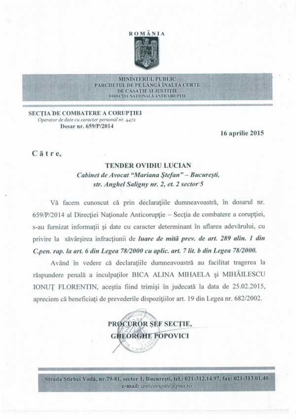 Pentru că omul de afaceri era neîncrezător, i se trimite de către DNA următorul Document, pe care-l publicăm în premieră, pentru a dovedi învățătura Cine o face ca Ovidiu Tender, ca Ovidiu Tender să pățească!: