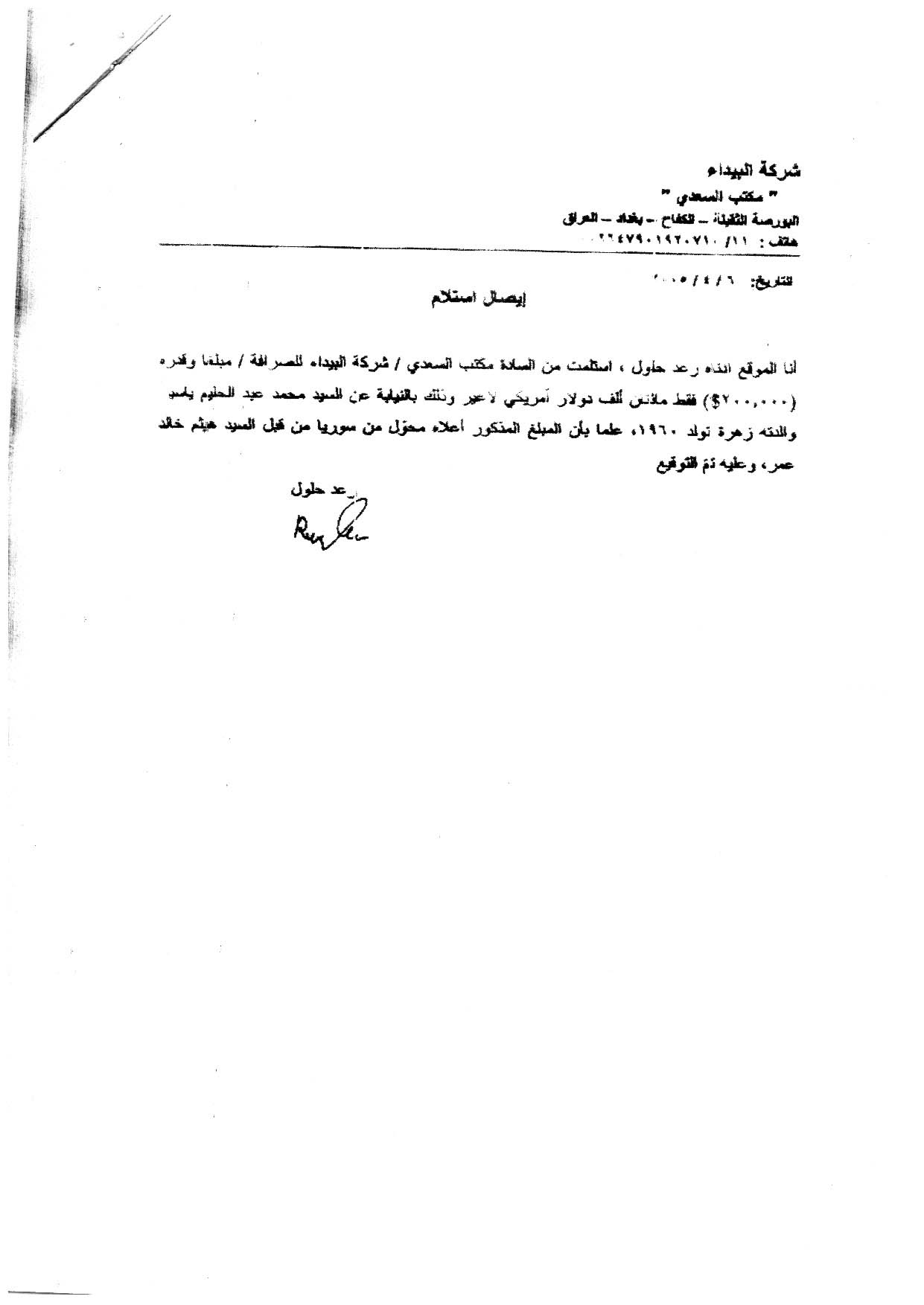 Singura plata efectuata in 2005 in Irak (chitante) este o suma in cuantum de 200.000 de dolari, transferata de Hayssam Omar din Siria (ceea ce infirma orice supozitie legata de intentia acestuia de a scoate niste bani din Romania). Despre suma in cauza s-a afirmat de catre Mohammad Yassin ca era destinata a acoperi cheltuieli. Suma este mult prea mare pentru a justifica cheltuieli curente de calatorie si reprezentare, chiar si pentru o deplasare intr-o tara scumpa. In Irak, in anul 2005, dinarul ajunsese dupa zece ani de embargou si doi de razboi, la cota de cca 2500 dinari/dolar American. Un salariu lunar era la nivelul a 5-6 dolari iar o suma acoperitoare pentru orice intreprindere era de nivelul citorva sute sau mii de dolari. Foarte probabil aceasta suma- 200.000 – reprezinta sau include recompensa platita grupului care a retinut si pastrat in custodie pe Marijeanne Ion, Sorin Miscoci, Ovidiu Ohanesian si Mohammad Munaf.