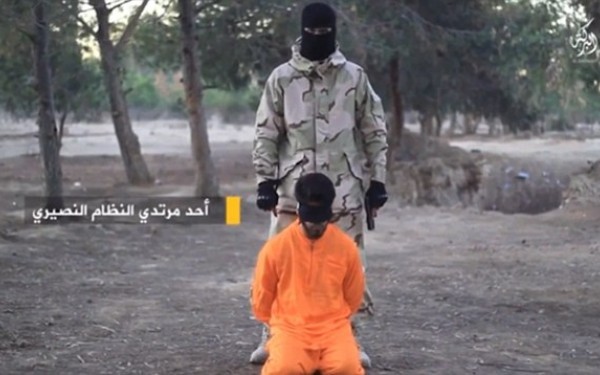 Acesta este imbracat in traditionala salopeta portocalie, folosita de ISIS la executii, si este impuscat in cap in timp ce atarna de un copac, cu capul in jos.