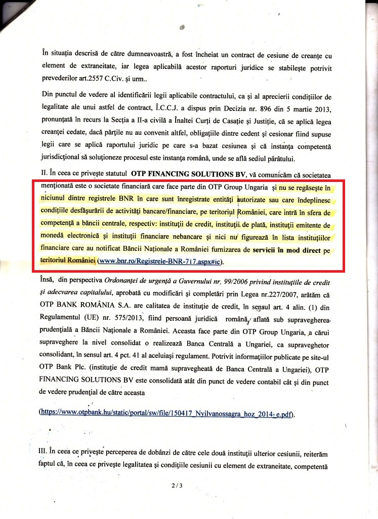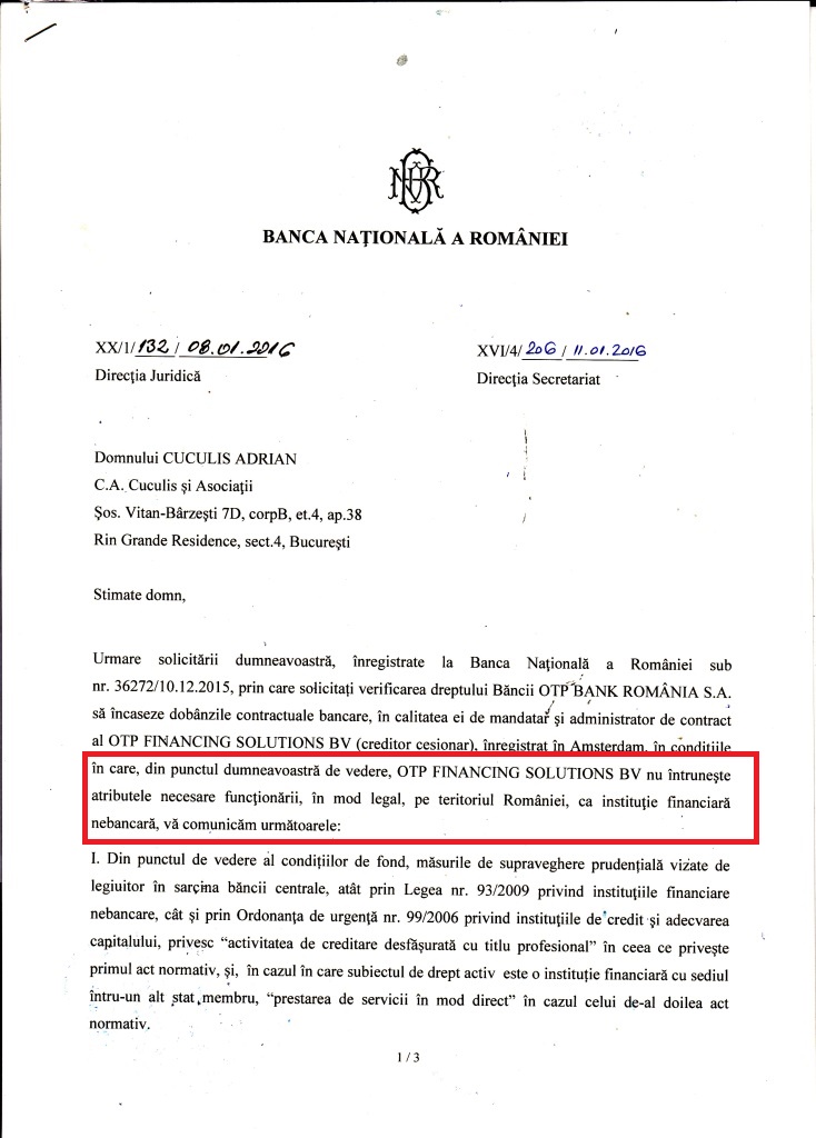 Subsemnatul Av. Cuculis Adrian, in indeplinirea mandatului primit de la reclamantul Cimpu Nicolae, cu privire la actionarea in judecata a paratei OTP BANK ROMANIA si OTP FINANCING SOLUTIONS BV avand in vedere existenta unor clauze contractuale ce pot fi incadrate in sfera dispozitiilor legii 193/2000 cu privire la comisionul de acordare, pentru un credit ipotecar de investitii imobiliare cat si posibilitatea unilaterala de modificare a dobanzii contractuale, a bancii OTP BANK ROMANIA, aspecte ce deriva din contractul cadru notificat catre dumneavoastra de catre operatorul financiar, va solicitam ca in raport de dispozitiile art. ARTICOLUL 25 din legea 312 din 2004 (1) Banca Naţională a României are competenţa exclusivă de autorizare a instituţiilor de credit şi răspunde de supravegherea prudenţială a instituţiilor de credit pe care le-a autorizat să opereze în România, în conformitate cu prevederile Legii nr. 58/1998 privind activitatea bancară, cu modificările şi completările ulterioare, sa emiteti un punct de vedere, cu privire la posibilitatea efectiva, a unei institutii ce cesioneaza un contract de credit bancar de la o entitate juridical autorizata de catre BNR, de a incasa de la momentul cesiunii, dobanzile contractuale pe care institutia bancara le percepea imprumutatului.