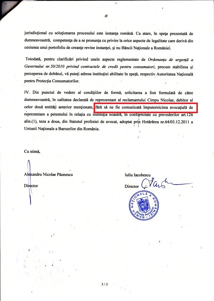 Trebuie sa recunosc ca grija mea personala nu a fost sa depun imputernicirea avocatiala, pentru ca BNR sa-mi raspunda punctual pentru unul dintre imprumutatii OTP BANK ROMANIA ci a fost mai degraba grija de a afla pozitia bancii centrale ce se ocupa de activitatea “prudentiala” in timp ce institutii din Ungaria se ocupau de incasarea banilor imprumutatilor pe care ei ii plateau cu greu iar aceasta institutie nu avea dreptul sa ii incaseze.