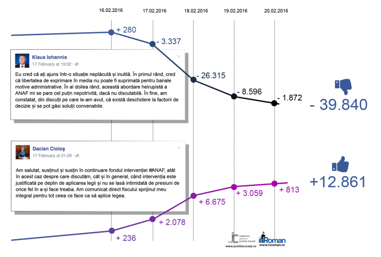 Atitudinea diferită a premierului Dacian Cioloș i-a adus acestuia succes în mediul online. Chiar și așa, premierul are de aproape 30 de ori mai puțini fani. Ce-i drept, Cioloș nu a avut parte de o campanie electorală pentru a se investi în imaginea lui. În ultima săptămână, capitalul de imagine – trasformat în like-uri – a fost o consecință a modului în care el a reușit să țină piept politrucilor din Parlament și a faptului că a răspuns multora dintre cei care au comentat online despre cazul ANAF – Antena 3, fără a încerca să șteargă mesajele negative, așa cum s-a chinuit echipa președintelui.