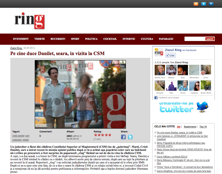 “Jurnaliștii” de la Ring au publicat ieri un material despre judecătorul Cristi Danileț, membru CSM, sub titlul “Pe cine duce Danileț, seara, în vizită la CSM”. În material sînt prezentate o serie de poze surpinse de paparazzi, în care judecătorul apare ținînd de mînă o domnișoară (minoră) cu care intră în sediul CSM, apoi se plimbă pe stradă ținînd-o de după umeri, pentru ca în final să o ducă la el acasă.