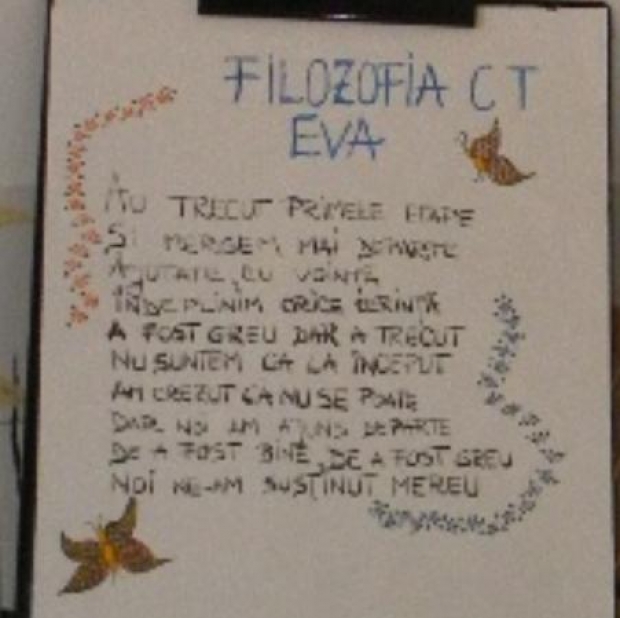 La o privire mai atentă poţi observa că este posibil ca din punct de vedere al psihicului situaţia să nu stea chiar aşa de bine pentru deţinutul Elena Udrea (vezi foto cu motto-ul din camera terapeutică a penitenciarului).