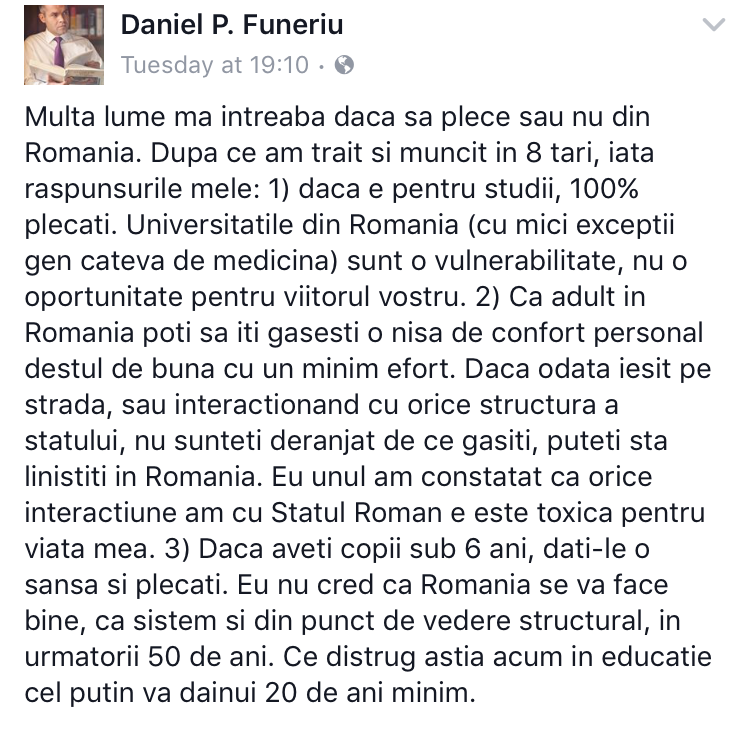„Multa lume ma intreaba daca sa plece sau nu din Romania. Dupa ce am trait si muncit in 8 tari, iata raspunsurile mele: 1) daca e pentru studii, 100% plecati. Universitatile din Romania (cu mici exceptii gen cateva de medicina) sunt o vulnerabilitate, nu o oportunitate pentru viitorul vostru. 2) Ca adult in Romania poti sa iti gasesti o nisa de confort personal destul de buna cu un minim efort. Daca odata iesit pe strada, sau interactionand cu orice structura a statului, nu sunteti deranjat de ce gasiti, puteti sta linistiti in Romania. Eu unul am constatat ca orice interactiune am cu Statul Roman e este toxica pentru viata mea. 3) Daca aveti copii sub 6 ani, dati-le o sansa si plecati. Eu nu cred ca Romania se va face bine, ca sistem si din punct de vedere structural, in urmatorii 50 de ani. Ce distrug astia acum in educatie cel putin va dainui 20 de ani minim”.
