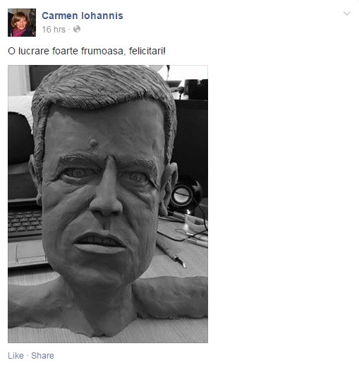Recent, Prima Doamnă a publicat pe contul său de socializare o sculptură bust cu președintele României, iar singurul comentariu făcut de aceasta este elocvent. ”O lucrare foarte frumoasă, felicitări!”, spune soția șefului statului.