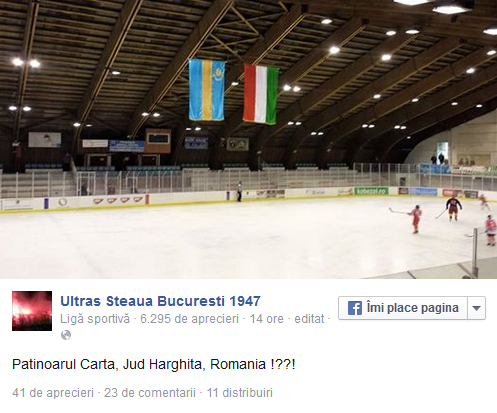 „Wtf ?! Drapelul ungariei intr-un patinoar din Romania ?? (…)”, a comentat unul dintre utilizatori;
