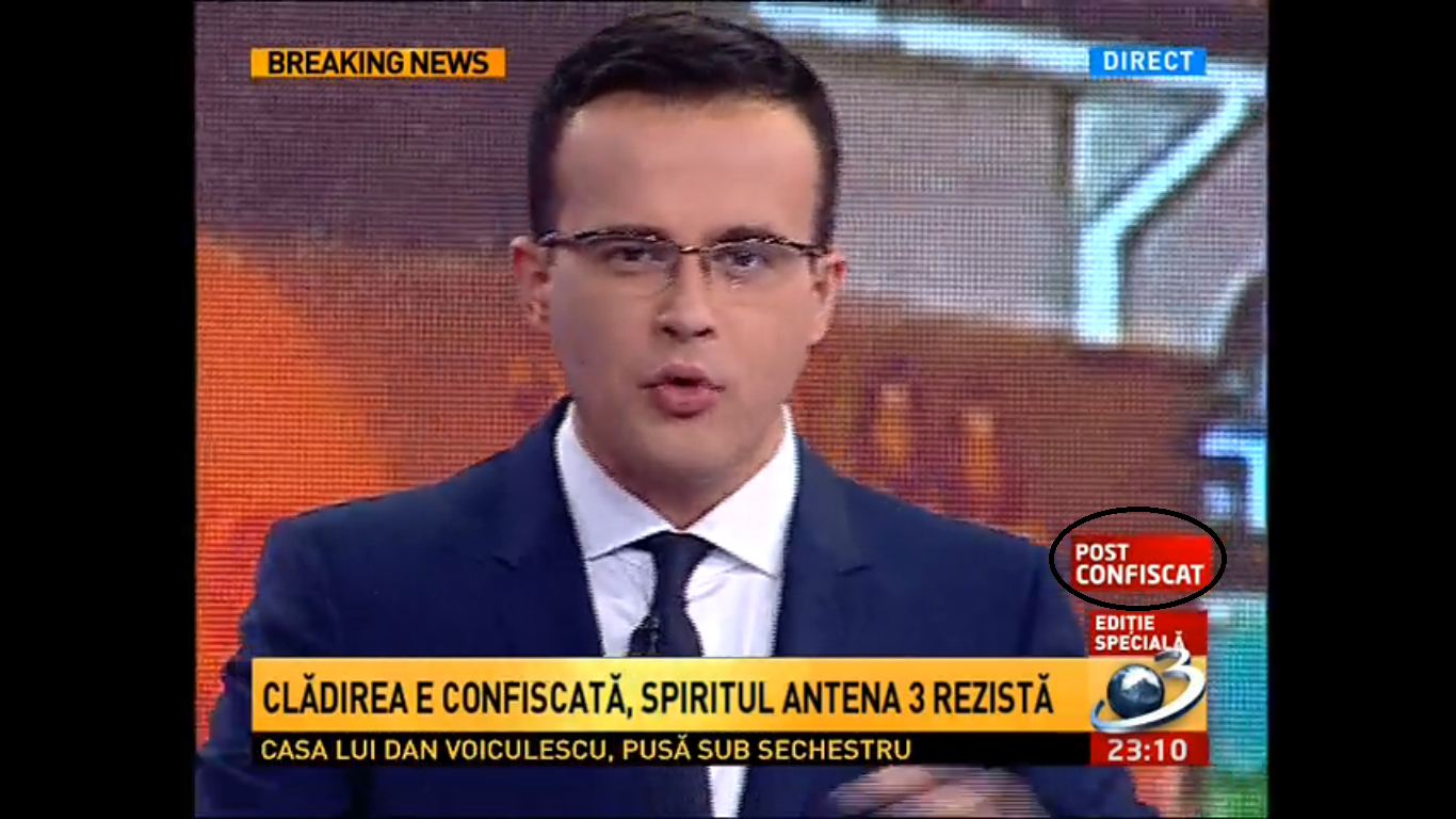 Eticheta ”post confiscat” este prezentă permanent pe ecran. Confiscarea dispusă de instanță este prezentată drept o încercare de intimidare a postului și un atac la libertatea de expresie. Pentru postul de știri asociat CNN, nu se mai întâmplă nimic altceva în lume. Nu mai difuzează nicio știre, în afara celor referitoare la sentința pronunțată vineri, 8 august, împotriva patronului său de facto, Dan Voiculescu. Premierul trimite pe Facebook mesaje încurajatoare pentru Antena 3, ”care va fi încă mulți ani aici”. Dar cine a pus altfel problema, în afara Antenei 3? Vedetele bat obrazul politicienilor care nu se solidarizează cu Antena 3. Mai ales celor din PNL. În studiouri, sunt aduși susținători politici și nepolitici, care-i încurajează să continue lupta. Terapie de grup și marketing politic. CNA e anihilat din cauza scandalului în care e implicată persoana care îl conduce. Tăcerea Antenei 3 în scandalul Laura Georgescu, propusă de Guvernul României în CNA, primește în schimb tăcerea CNA în scandalul Antena 3 vs. Justiție. Lăsat să se rostogolească fără nicio intervenție din partea CNA sau din partea CSM, acest demers pseudo-jurnalistic al Antenei 3 riscă să ajungă un bulgăre uriaș care poate demola construcția fragilă a instituțiilor statului. Astăzi, lovește într-un complet de judecată și în sentința dată de acesta, mâine lovește în guvernul care nu răspunde cererilor angajaților unui condamnat și tot așa, până când televiziunea va deveni noul tribunal al poporului. Prin satelit.