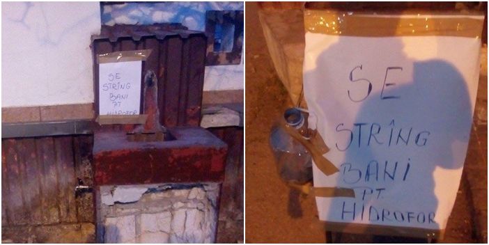 O fost pusă o sticlă de plastic lângă fântână, alături de un bileţel pe care stă scris: „Se strâng bani pentru hidrofor”.