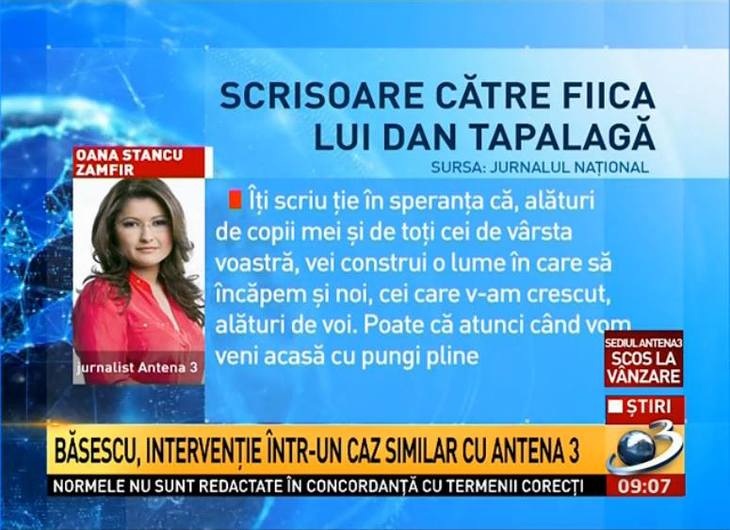 Până unde pot merge argumentația și mijloacele jurnaliștilor Antenei 3? Oana Stancu reacționează la articolele lui Dan Tăpălagă printr-un articol adresat nu jurnalistului, ci fiicei acestuia, în vârstă de 10 ani.