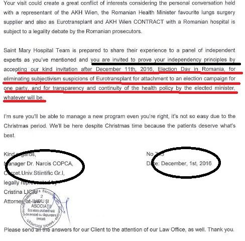 „Vizita dumneavoastra poate provoca un mare conflict de interese avand in vedere discutiile personale purtate cu reprezentantii AKH din Viena, spitalul preferat de Ministerul Sanatatii in ceea ce priveste transplantul de plamani, deoarece contractul dintre Eurotransplant, AKH Viena si un spital din Romania sunt subiectul unei investigatii a procurorilor. (Copca tocmai depusese la DIICOT o plangere vizand traficul de organe – n.red.)