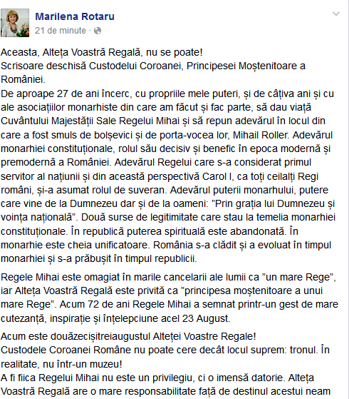 Aceasta, Alteța Voastră Regală, nu se poate!, scria anul trecut pe facebook cunoscuta monarhistă Marilena Rotaru, fost realizator tv şi conducător al organizaţiilor monarhiste din România.