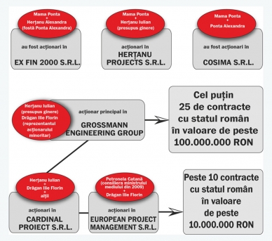 Legătura între filiera de contracte cu statul prin European Project Management şi filiera de contracte cu statul prin Grossmann Engineering Group e reprezentată de Florin Ilie Drăgan, care este reprezentantul acţionarului minoritar din Grossmann Engineering Group şi co-acţionar în European Project Management SRL.