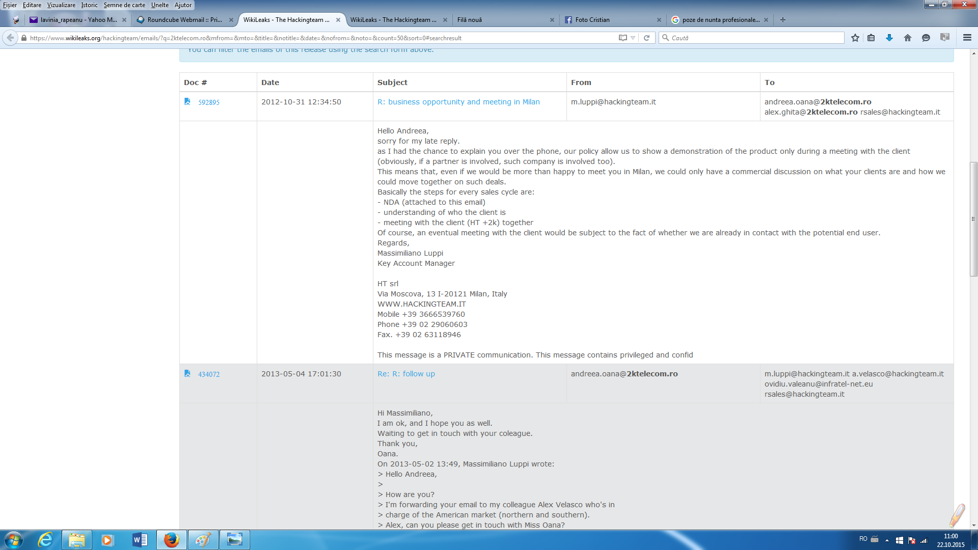 În octombrie 2012, Andreea Oana Arvanitopol și Alexandru Ghiță, reprezentanți ai firmei 2K Telecom, l-au contactat pe Massimiliano Luppi, reprezentant al firmei italiene HackingTeam. Românii doreau să stabilească o întâlnire pentru a vedea cum funcționează softul de spionaj vândut de firma italiană. Întalnirea trebuia să aibă loc în Italia la Milano, potrivit arhivei WikiLeaks disponibilă pe site-ul CRJI.