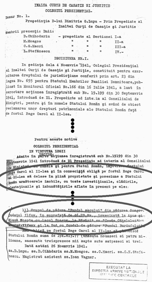 Este vorba despre o hotărâre irevocabilă a colegiului prezineţial (preşedinţii tuturor secţiilor) Înaltei Curţi de Casaţie şi Justiţie a României, dată la data de 26 noiembrie 1941, după abdicarea lui Carol şi înscăunarea regelui Mihai I: „Având în vedere că prin memoriul-întâmpinare depus de mandatarul fostului Rege Carol al II—lea se recunoaşte, în mod categoric, că nu s-au îndeplinit formele legale perntru transmisiunea proprietăţii pădurii în discuţiune; că neexistând o transmisiune a dreptului de proprietate asupra suprafeţei de pădure în discuţiune, urmează că deţinerea ei de către fostul Suveran este lipsită de un temei legal (Carol luase pusese stăpânire pe pădure, dar fără titlu legal) şi deci cererea făcută prin acţiunea de faţă de a fi obligat fostul rege Carol al II-lea să restituie acest bun Statului Român este întemeiată şi trebuie admisă (…) obligă pe fostul rege Carol al II-lea să delase în plină proprietate şi posesiune a Statului Român următoarele imobile: (…) Trupul de pădure «Fundul Sacului» din pădurea Snagov, judeţul Ilfov, în suprafaţă de 46,78 hectare învecinată la Apus şi Miazănoapte cu Lacul Snagov… „.