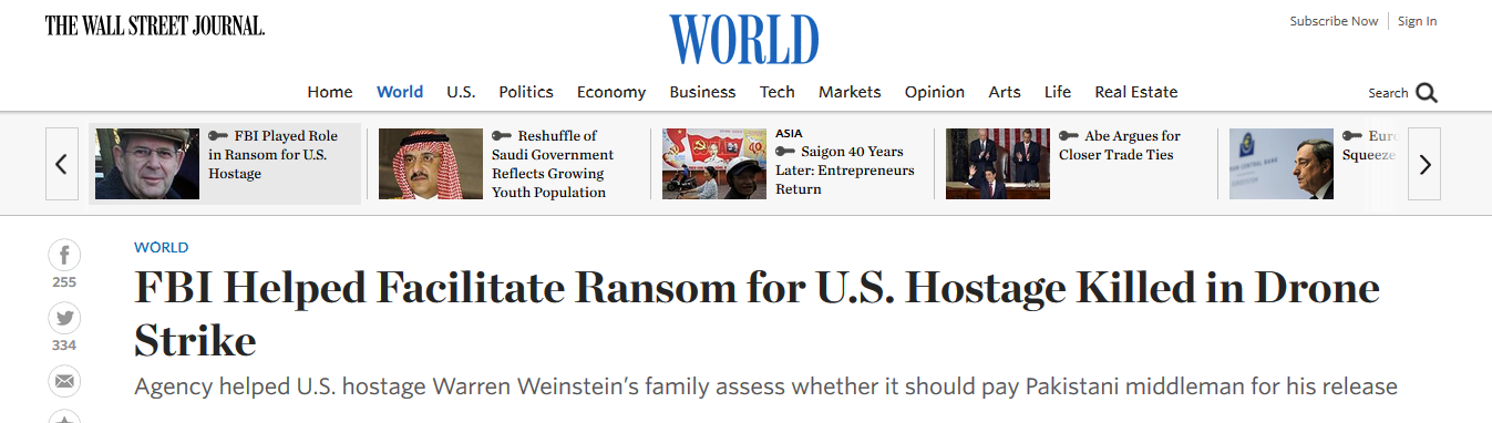 În cazul lui Warren Weinstein, un angajat umanitar răpit în Pakistan în 2011 și deținut de Al Qaida, familia sa a reușit în 2012 „să strângă bani pentru o răscumpărare de 250.000 de dolari din surse private”, a relatat WSJ, care se bazează pe mărturiile unor oficiali americani care s-au exprimat sub condiția anonimatului.