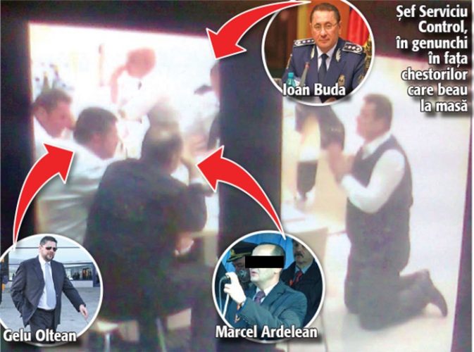 Pentru ca imaginile te socheaza si daca nu cunosti cine sunt cei din fotografii. Dar ce-ai putea simti daca la masa s-a afla chestorul Gelu Oltean, pe vremea cand era chiar seful serviciului secret al Ministerului de Interne? Si daca in camera era si chestorul Ioan Buda, fost secretar de stat al MAI si actualul inspector sef al Politiei de Frontiera? Si chestorul Marcel Ardelean, seful Directiei de Supraveghere si Controlul Trecerii Frontierei si cel care era atasatul MAI la Paris in perioada cand la Ambasada Romaniei in Franta s-a votat pro-Basescu intr-un ritm pe care nu l-ar reusi nici robotii? Si alti ofiteri superiori, chiar sefi de structuri din IGPFR, dintre care unii, ce-i drept, intorc capul, jenati si ei de scena terifianta ce se petrecea la ultimul etaj al chiar sediului central al Politiei de Frontiera! Acolo unde credeau ca nu pot fi „luati” pe tehnica decat din spatiu… Iar daca ancheta interna pe care cu siguranta o va declansa conducerea actuala a MAI va confirma ca omul din genunchi nu este nici vreu infractor marunt care cere mila „gaborilor”, nici vreun ospatar care a turnat vin pe meseni, ci chiar comisarul sef Aurelian Miu, insusi seful Serviciului Control din IGPFR! Adica omul care ar trebui sa-i controleze pe cei in fata carora ingenuncheaza, probabil cerandu-si iertare pentru ca o fi verificat pe vreun protejat…
