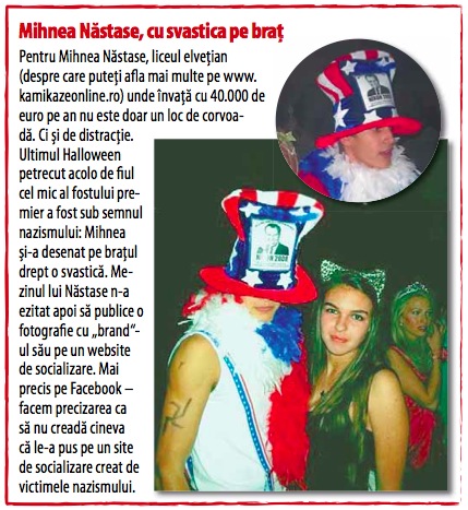 Pentru Mihnea Năstase, liceul elvețian unde învață cu 40.000 de euro pe an nu este doar un loc de corvoadă. Ci și de distracție. Ultimul Halloween petrecut acolo de fiul cel mic al fostului premier a fost sub semnul nazismului: Mihnea și-a desenat pe brațul drept o svastică. Mezinul lui Năstase n-a ezitat apoi să publice o fotografie cu “brand”-ul său pe un website de socializare. Mai precis pe facebook – facem precizarea ca să nu creadă cineva că le-a pus pe un site de socializare creat de victimele nazismului.