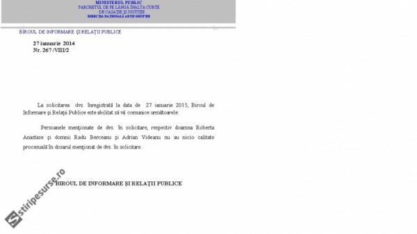 „Persoanele menţionate de dvs. în solicitare, respectiv doamna Roberta Anastase şi domnii Radu Berceanu şi Adrian Videanu nu au nicio calitate procesuală în dosarul menţionat de dvs. în solicitare”, se arată în răspunsul de la DNA.