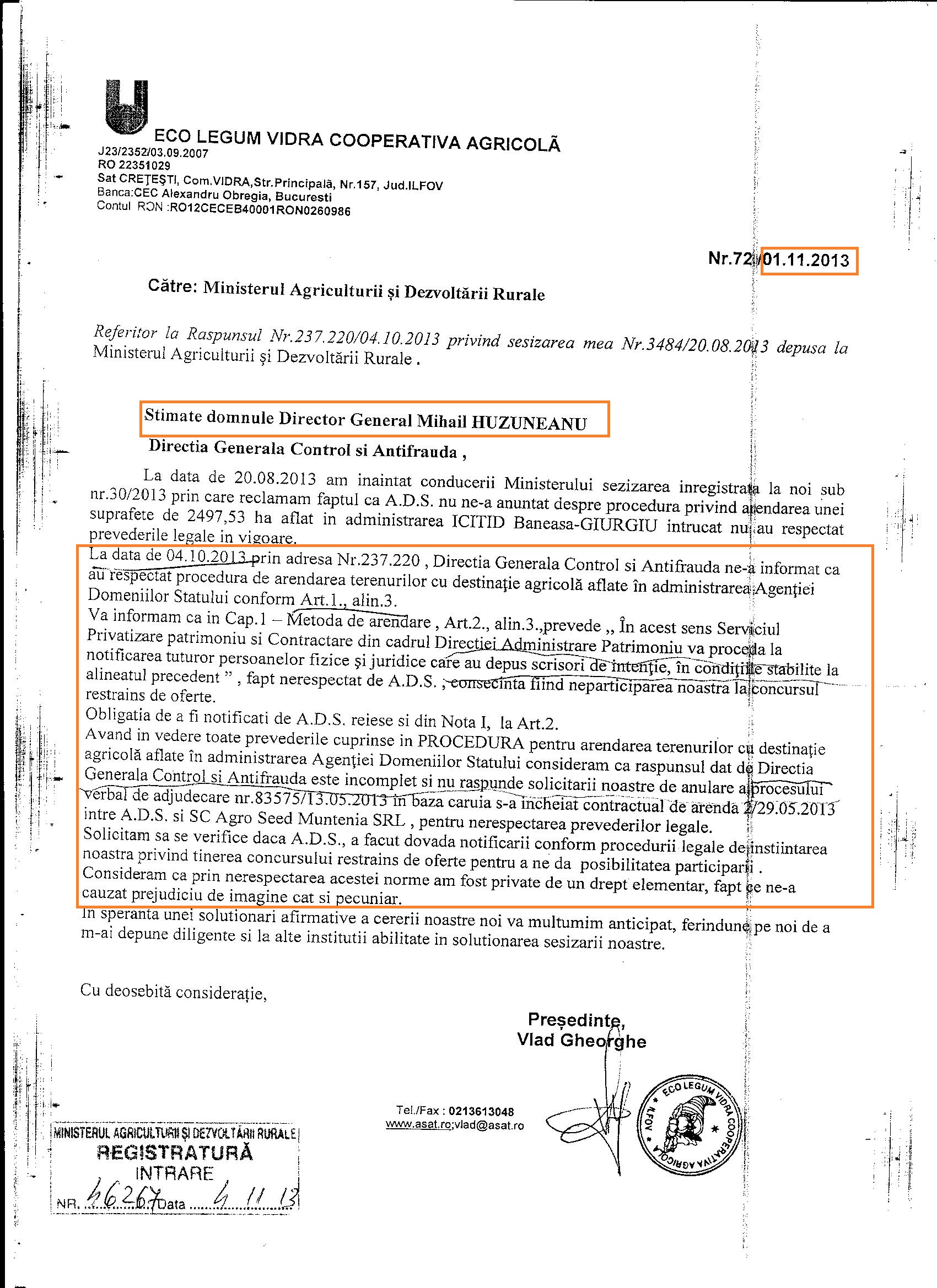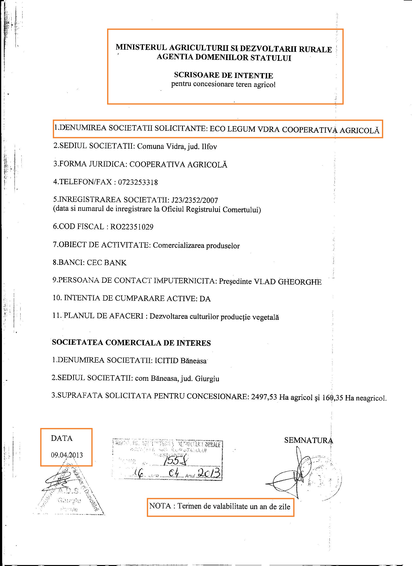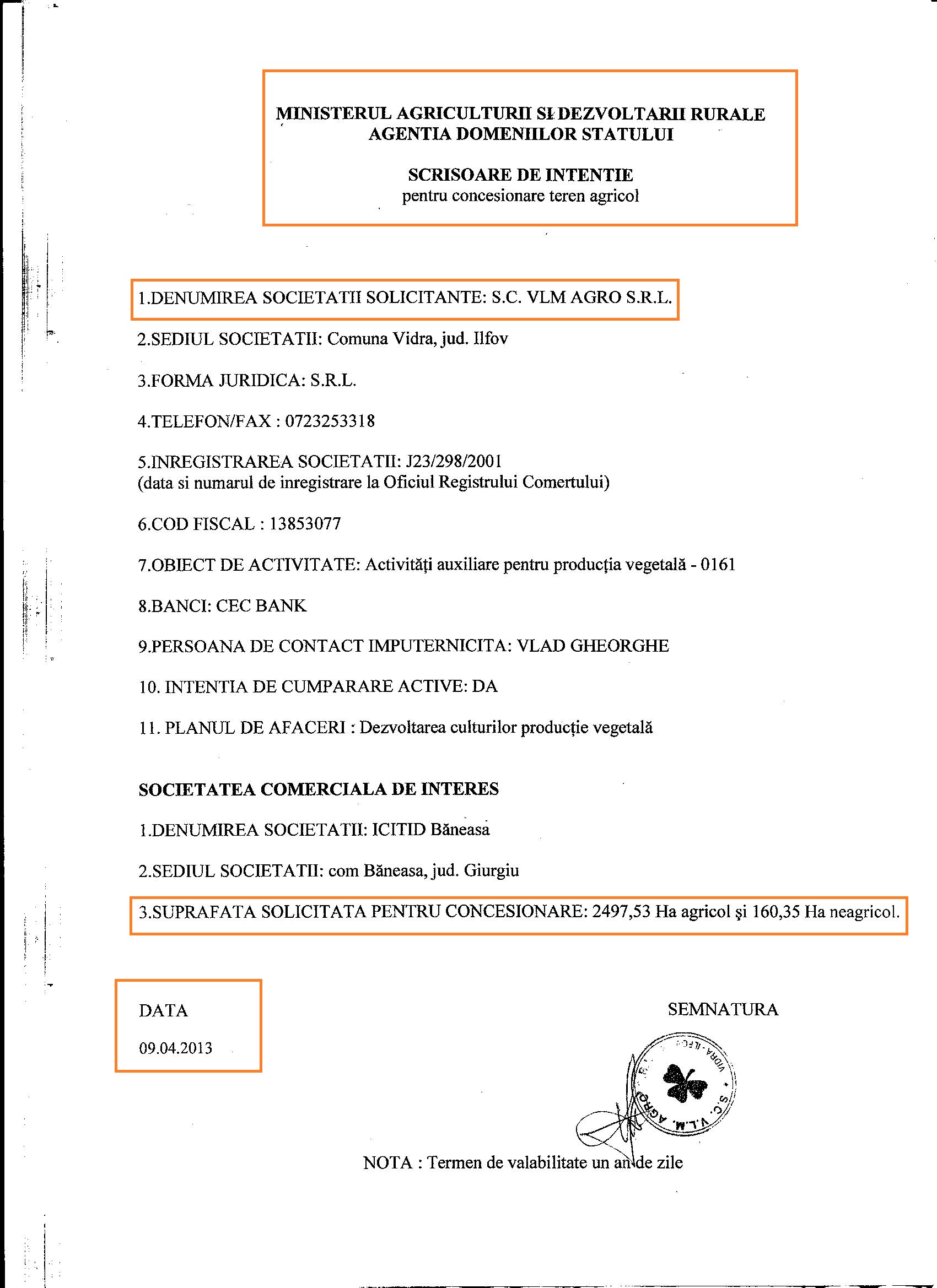 Va aratam acum o zi cum un grup de fermieri din Giurgiu a incercat in perioada in care Voiculescu nu avea contract de arenda pe cele 2600 de hectare, adica la inceputul anului 2013, sa incheie ei un contract de arenda cu ADS. Ei bine, desi au trimis inca din 9 aprilie 2014 scrisorile lor de intentie, prin care-si exprimau dorinta de a fi arendasii acestui teren, fermierii au fost exclusi din procedura de selectie chiar de angajatii ADS! Mai mult, asa cum ati aflat deja, l-au avertizat pe Felix ca incearca altcineva sa-i “sufle” afacerea din Giurgiu si l-au chemat repede sa incheie prin firma SC Agro Seed Muntenia SRL, un nou contract de arenda prin metoda “concurs restrins de oferte” pentru cele 2600 de hectare. Iata in continuare doua scrisori de intentie trimise, repet, pe 9 aprilie 2013, la ADS, de catre ECO LEGUM VIDRA COOPERATIVA AGRICOLA si SC VLM AGRO SRL: