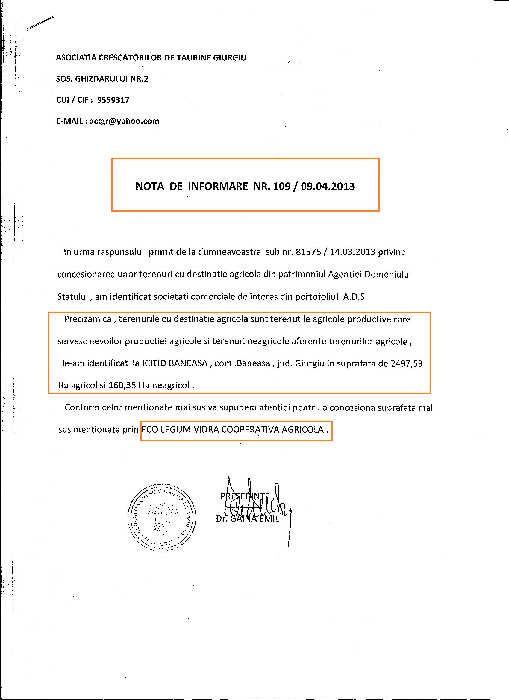 Mai mult, o alta asociatie, a CRESCATORILOR DE TAURINE din Giurgiu, trimite si ea o scrisoare catre Ministerul Agriculturii (ADS) prin care isi exprima intentia ferma de a concesiona cele 2600 de hectare “de aur”. In nota de informare de mai jos veti vedea ca si aceasta Asociatie a “identificat la ICITID Baneasa” cele 2497,53 ha de teren agricol si 160,35 ha de teren neagricol care, insumate, formeaza cele peste 2600 de hectare “ale lui Voiculescu”.