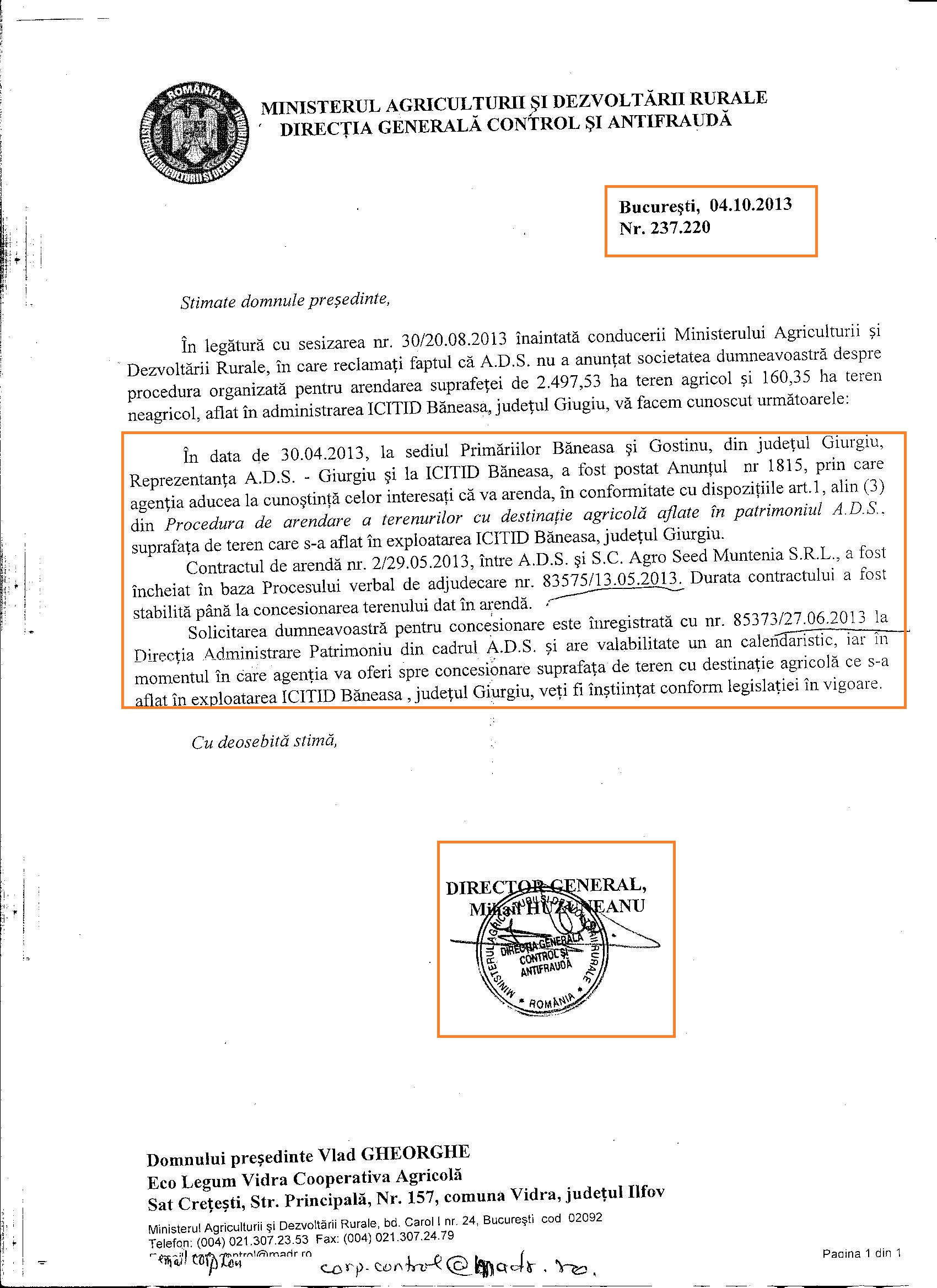 Si acum, spre a intelege pe deplin cum stau lucrurile cu Voiculescu si ADS, priviti cele doua documente de mai jos, prin care fermierilor li s-a dat cu flit! Desi au fost primii care au solicitat arendarea terenului, inca din 9 aprilie 2013, ADS a preferat sa “uite” de ei si sa incheie contract cu firma lui Voiculescu prin metoda “concurs restrins de oferte”.