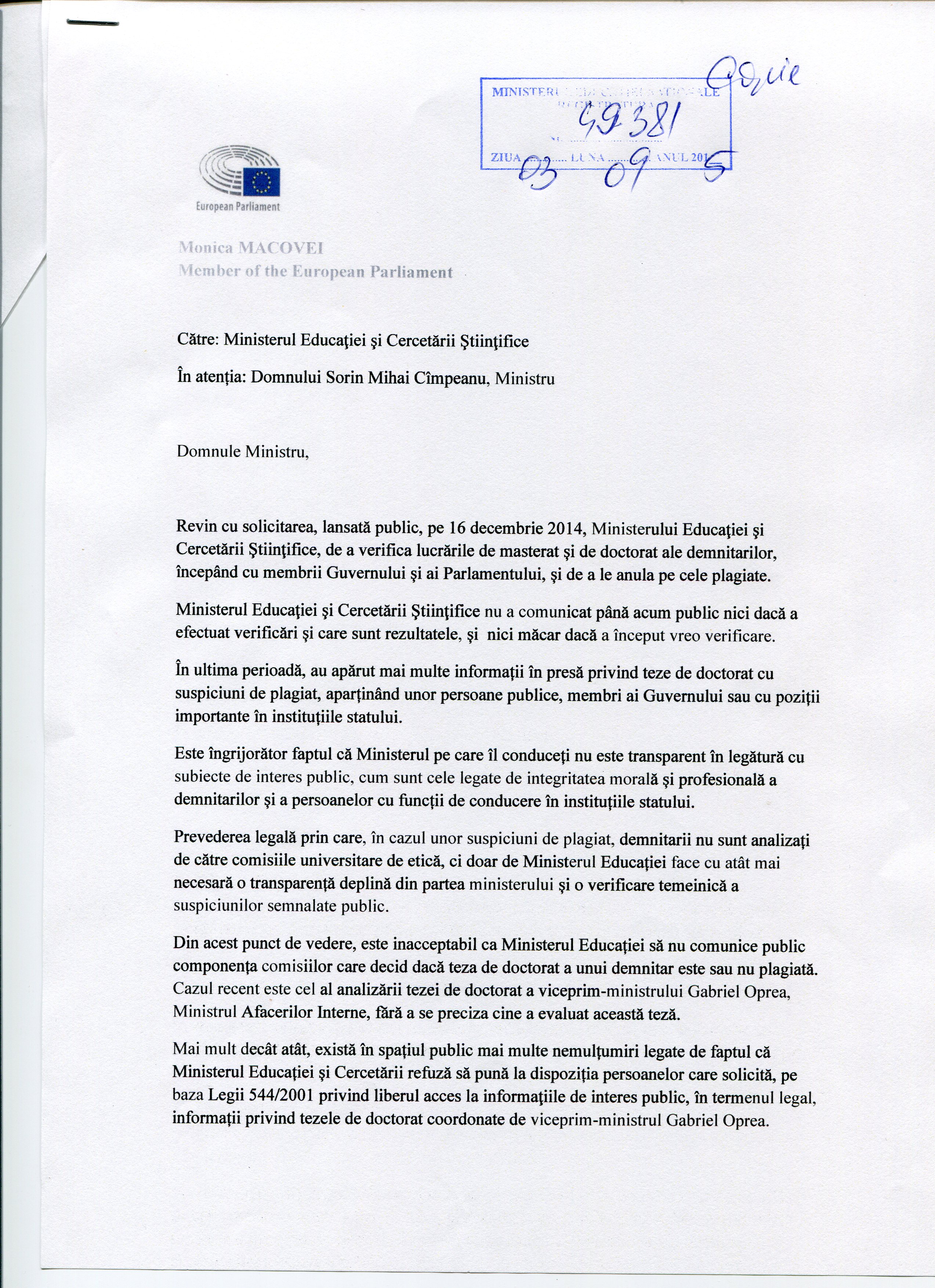 Europarlamentarul Monica Macovei solicită ministrului Educației, Sorin Mihai Cîmpeanu, să demareze acțiunea de verificare a tezelor de masterat și de doctorat ale demnitarilor, începând cu membrii Guvernului și ai Parlamentului, precum și ale persoanelor cu funcții de conducere în instituțiile publice.