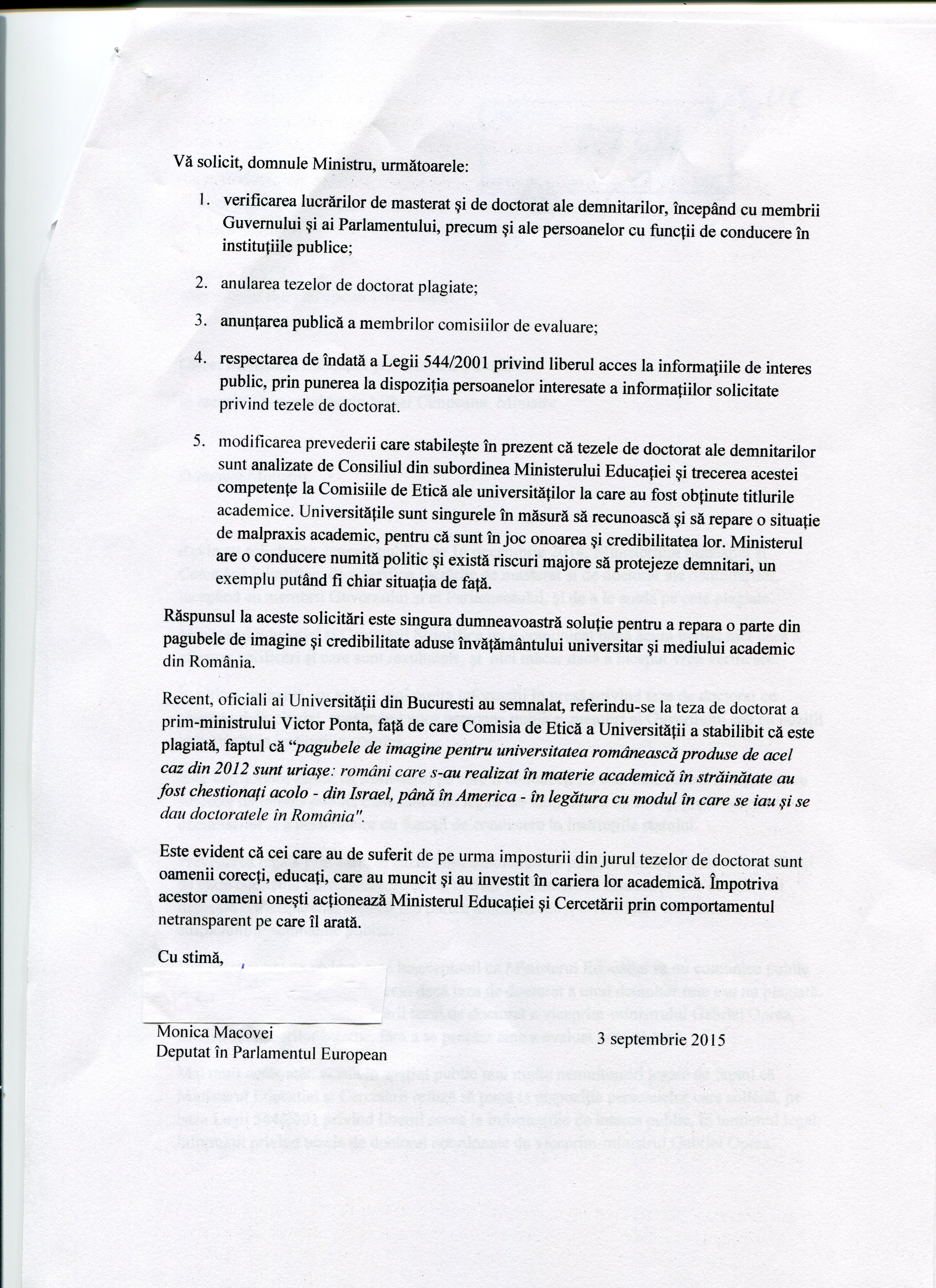 Monica Macovei solicită, de asemenea, anularea tezelor de doctorat plagiate; anunțarea publică a membrilor comisiilor de evaluare; transparență din partea Ministerului Educației privind solicitările depuse în baza Legii 544/2001 privind tezele de doctorat coordonate de ministrul Afacerilor Interne, Gabriel Oprea.
