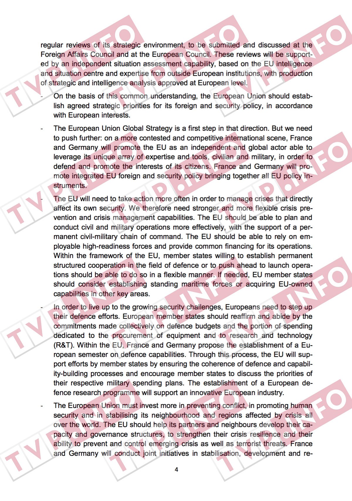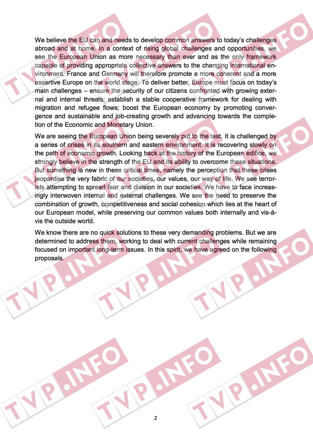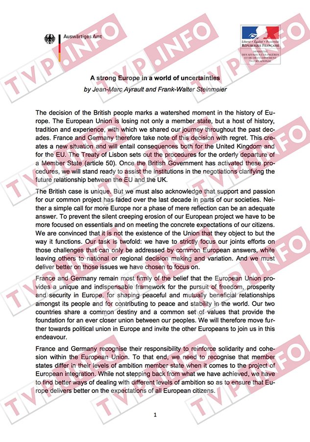 Televiziunea Poloneză TVP – postul de stat – a făcut public astăzi un document pe care Frank-Walter Steinmeier, Ministrul de Externe al Germaniei îl va prezenta în cursul acestei după-amiezi la Praga reprezentanților țărilor din Grupul de la Vișegrad (Polonia Cehia, Slovacia, Ungaria), potrivit site-ului inliniedreapta.net