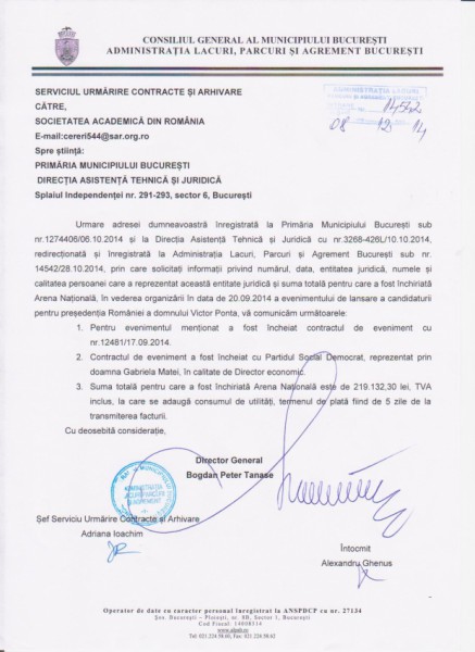 Pe 20 septembrie, Arena Naţională a fost acontată de social-democraţi pentru o sumă uriaşă după cum dezvăluie jurnalistul Vlad Petreanu pe blogul său – www.petreanu.ro. La o solicitare oficială a acestuia, Primăria Capitalei a dezvăluit că PSD a plătit pentru închirierea Arenei suma de 219.132,30 RON, la care se adăuga şi consumul de utilităţi.