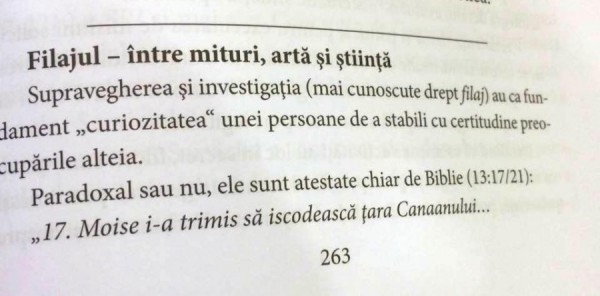 filajJurnalista Sidonia Bogdan de la Romania Libera a publicat pe facebook un fragment din Monografia SRI publicata anul acesta cu prilejul aniversarii a 25 de ani de la infiintare in care principalul serviciu secret din Romania justifica filajul printr-un fragment din Biblie.
