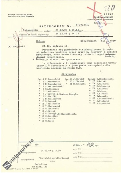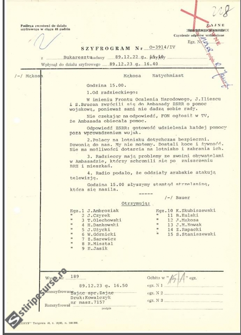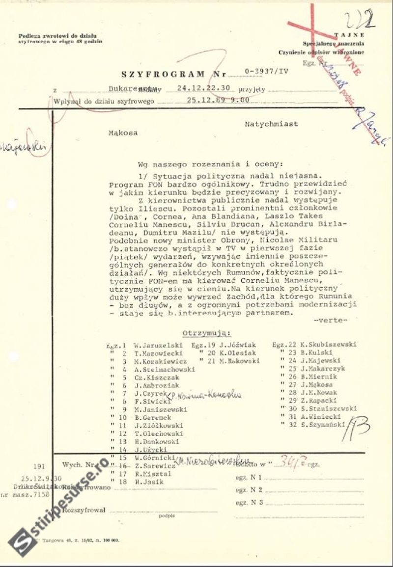 Cunoscut publicului românesc încă de acum patru ani, documentul original al mesajelor cifrate trimise de Ambasada Poloniei la Bucureşti către centrala din Varşovia a fost publicat în premieră pe pagina de Facebook a reprezentanţei diplomatice. În primul mesaj, transmis pe data de 23 decembrie 1989, unul dintre diplomaţii polonezi relatează ceea ce i s-a spus de către un diplomat de la Ambasada URSS-ului la Bucureşti: