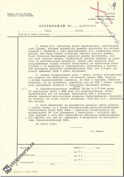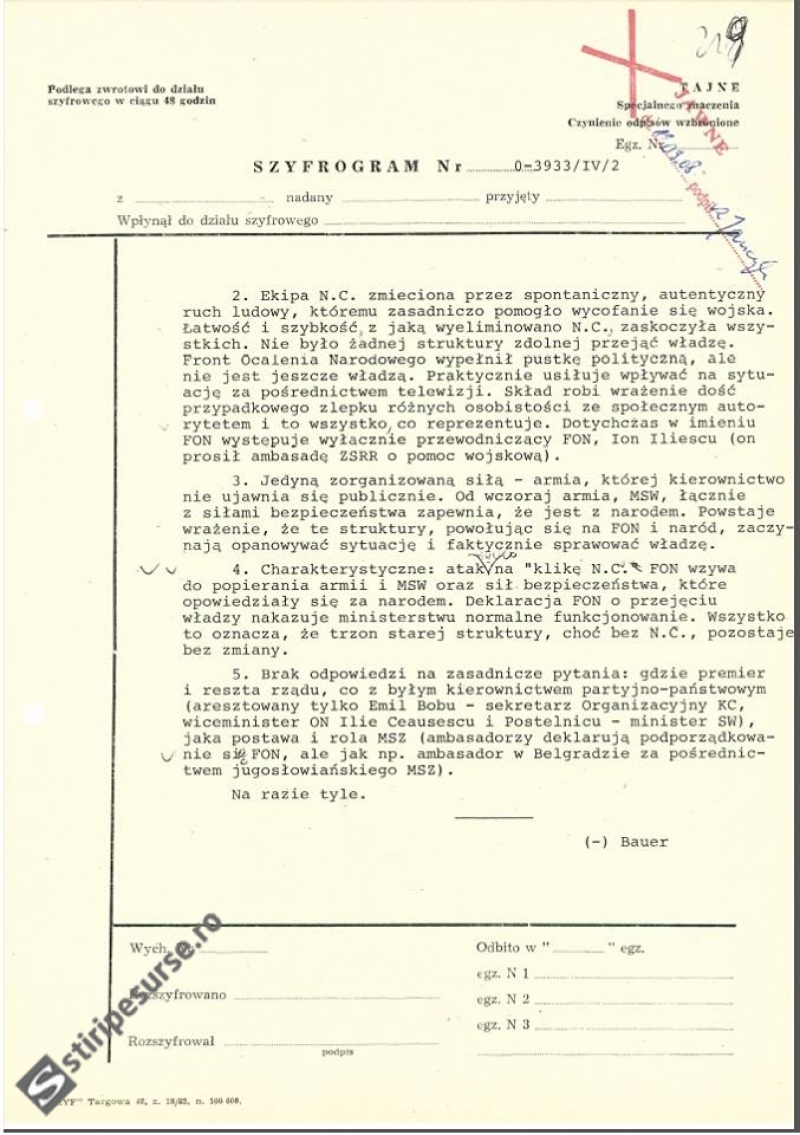 „Caracteristic: atac numai la „clica Nicolae Ceauşescu”. FSN chemă la sprijinirea Armatei şi a Ministerului Afacerilor Interne şi a serviciului de securitate, care s-au declarat de partea poporului. În declaraţia FSN despre preluarea puterii se solicită ministerului să funcţioneze în mod normal. Asta înseamnă că miezul vechii structuri, deşi fără Nicolae Ceauşescu, a rămas neschimbat.”, continuă analiza diplomaţilor polonezi.