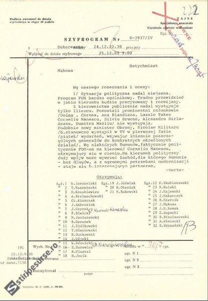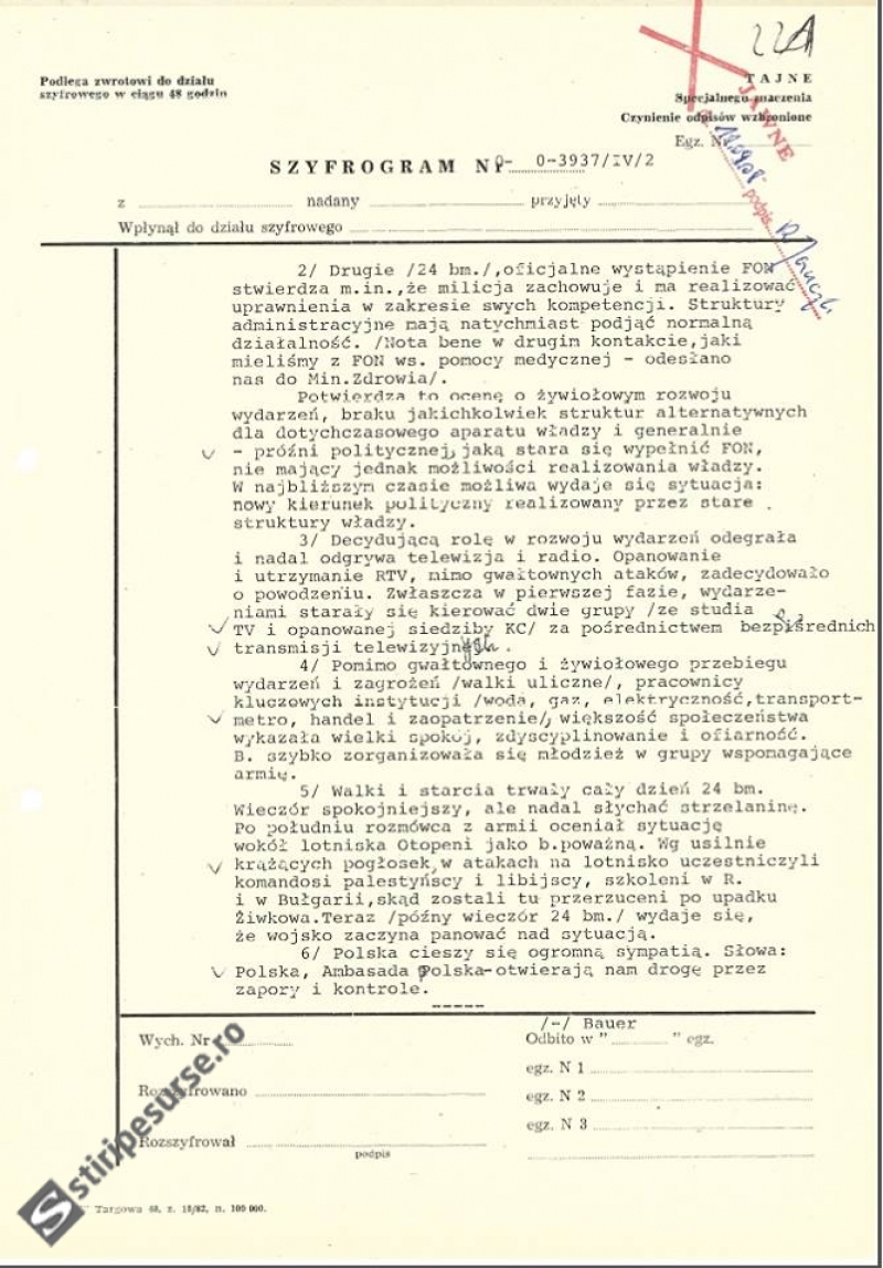 „La aniversarea a 25 de ani de la revoluţia românească, vă prezentăm mesajele cifrate desecretizate transmise de către diplomaţii polonezi