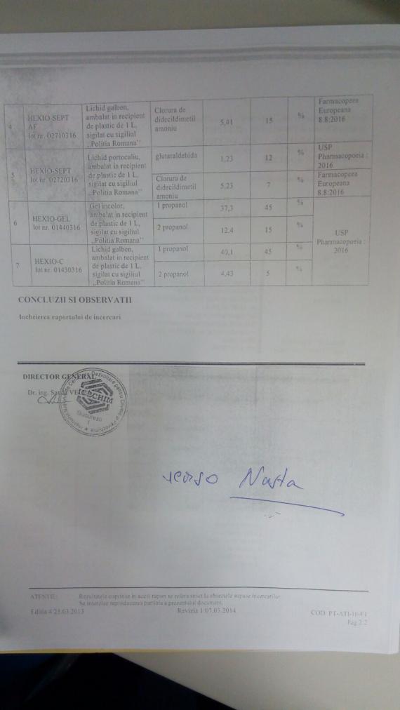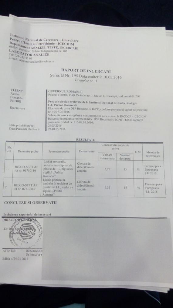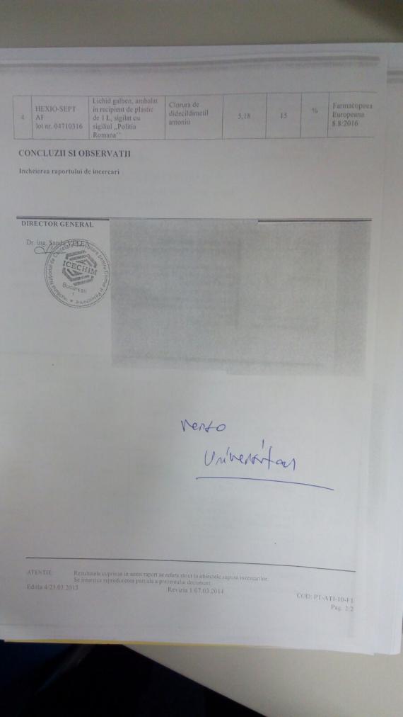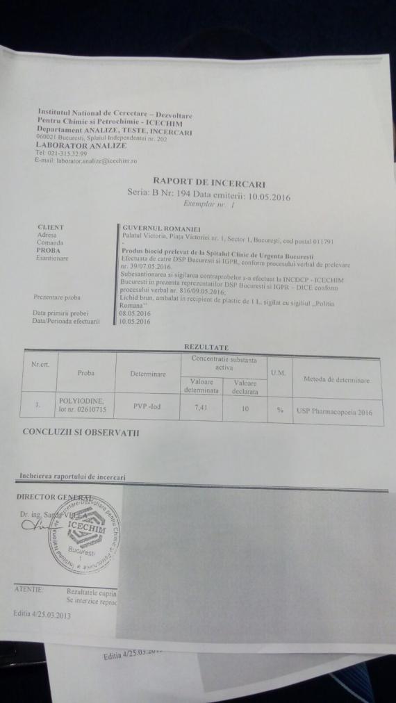 În plus, în proba de Hexio-Sept de la Spitalul Universitar, o a doua substanţă (glutaraldehidă) era diluată de 10 ori. Analizele au arătat o concentraţie de 1,23%, faţă de cele 12 procente scrise pe etichetă.