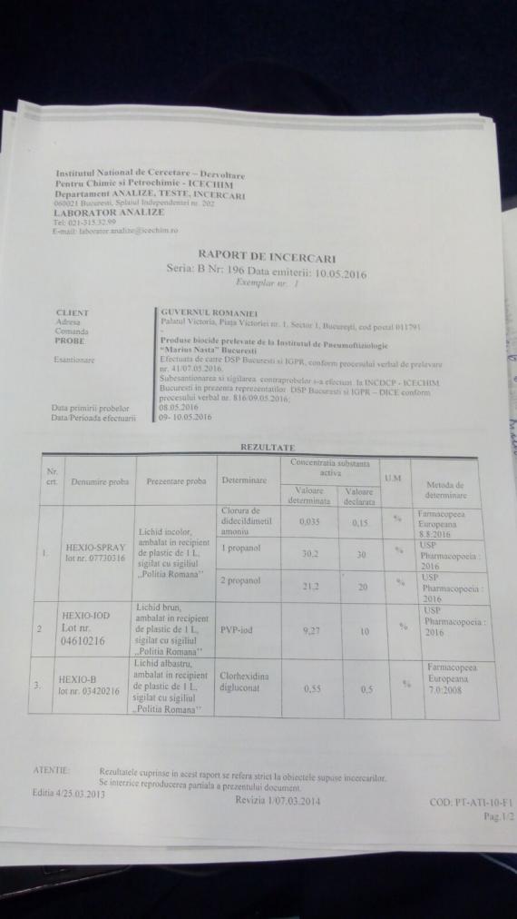 Cele 14 probe de produse Hexi Pharma ale căror analize au fost prezentate astăzi de Guvern au fost luate din patru spitale bucureştene. Este vorba despre dezinfectanţi folosiţi în Spitalul Floreasca, în Spitalul Universitar, Institutului „C.I. Parhon” şi Institutul „Marius Nasta”. Iar proba de dezinfectant diluată de 2.500 de ori provine de la Universitar, infrmeaza digi24.ro.