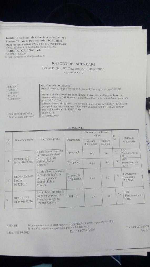 Analizele făcute în laboratorul ICECHIM produsului Hexio-Skin arată o concentraţie mai mică de 0,01% a substanţei propanol. Conform etichetei, concentraţia trebuia să fie de 25%! Proba din substanţa cu care chirurgii se spală pe mâini înainte să intre în operaţie a fost luată din Spitalul Universitar.