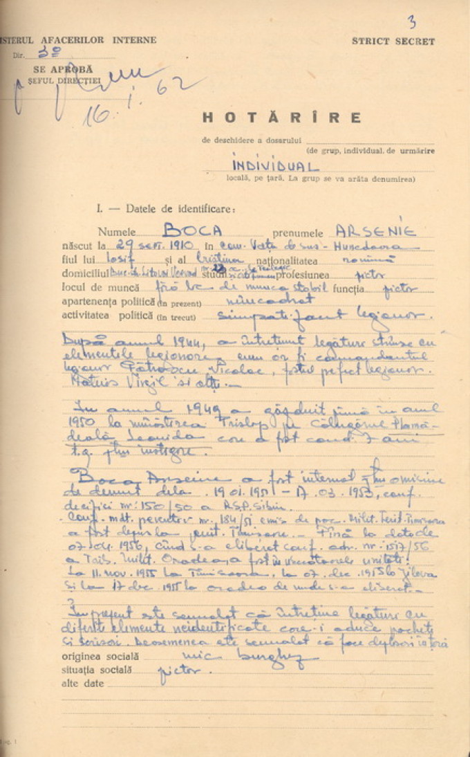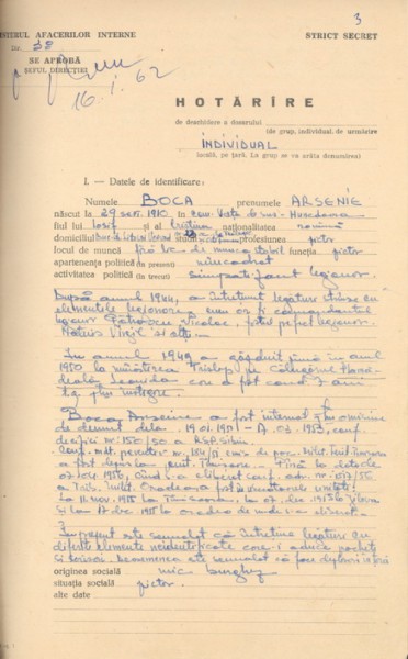 In arhiva fostei Securitati exista sase dosare pe numele lui. Primul document de urmarire informativa care il avea in atentie pe Arsenie Boca a fost redactat in 1942 din ordinul maresalului Ion Antonescu, perioada in care era duhovnic la Sambata.