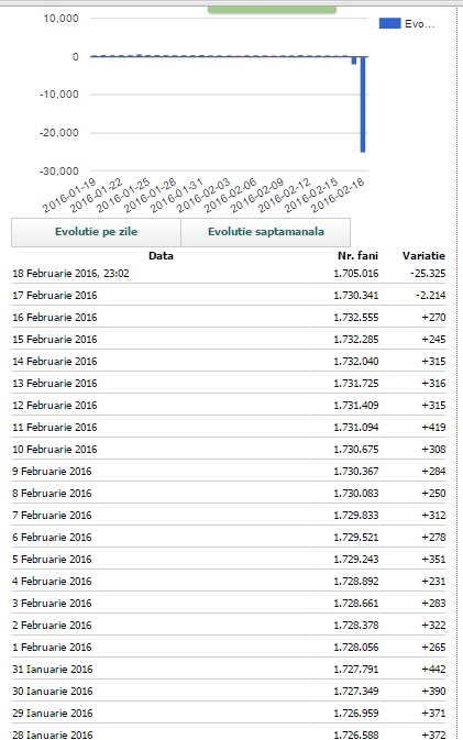 În fiecare zi din ianuarie și februarie, pagina de Facebook a lui Klaus Iohannis a încheiat cu plus de 2-400 de utilizatori; pe 17 februarie a pierdut peste 2.000, iar pe 18 februarie peste 25.000. Sursa: facebrands.ro